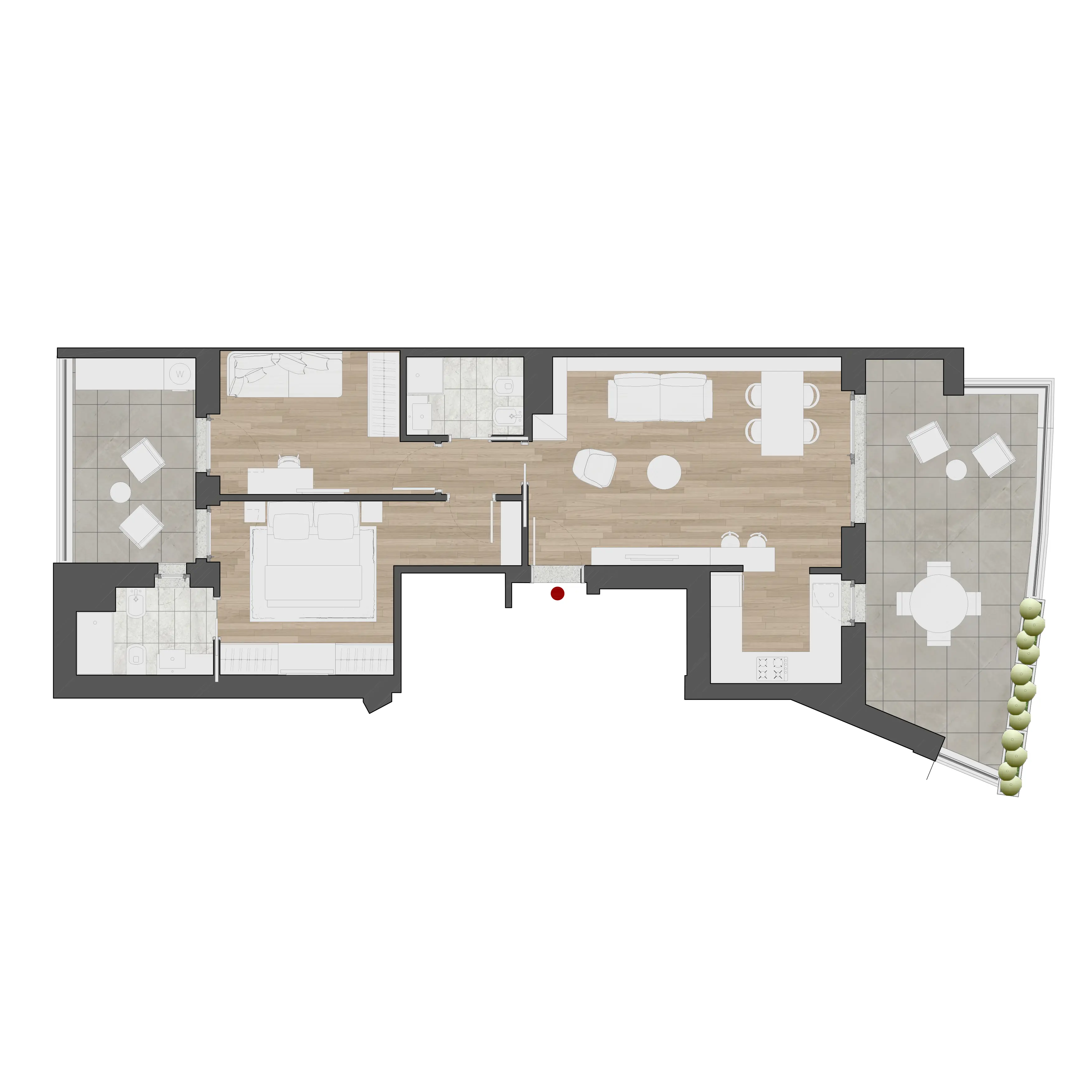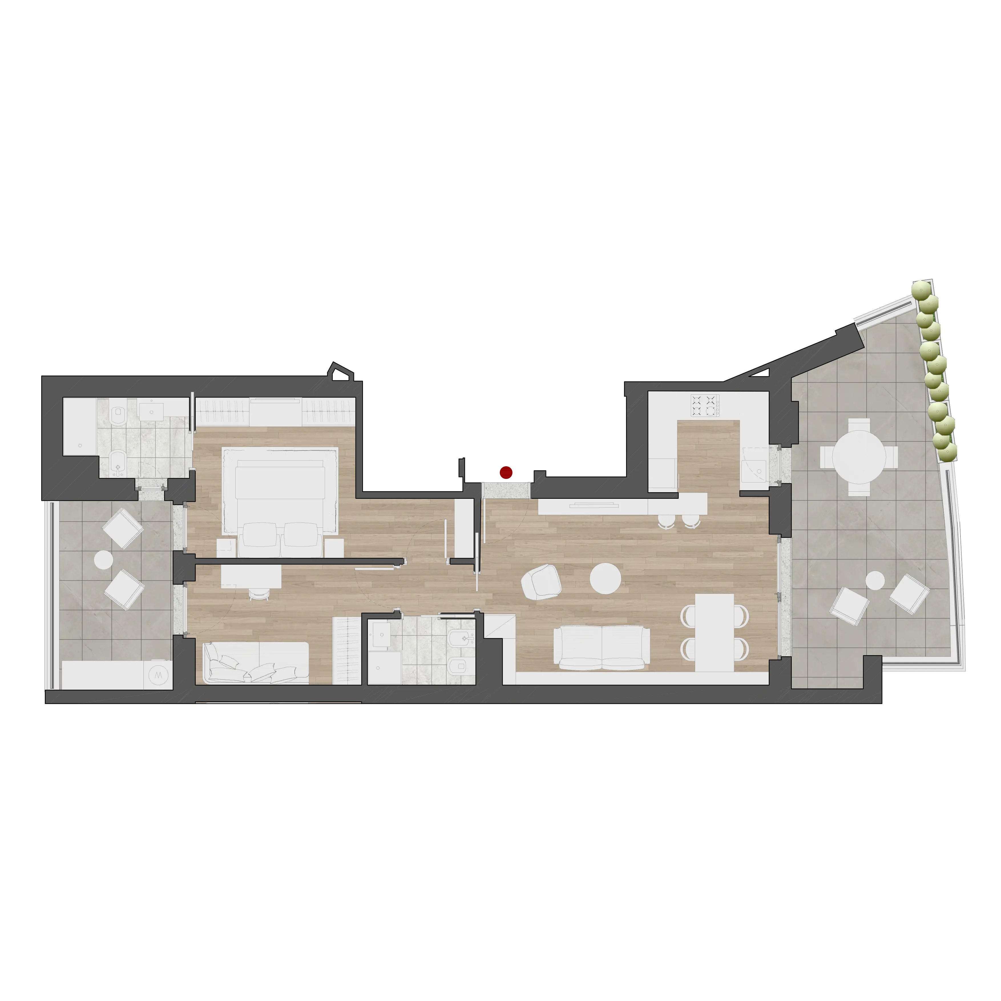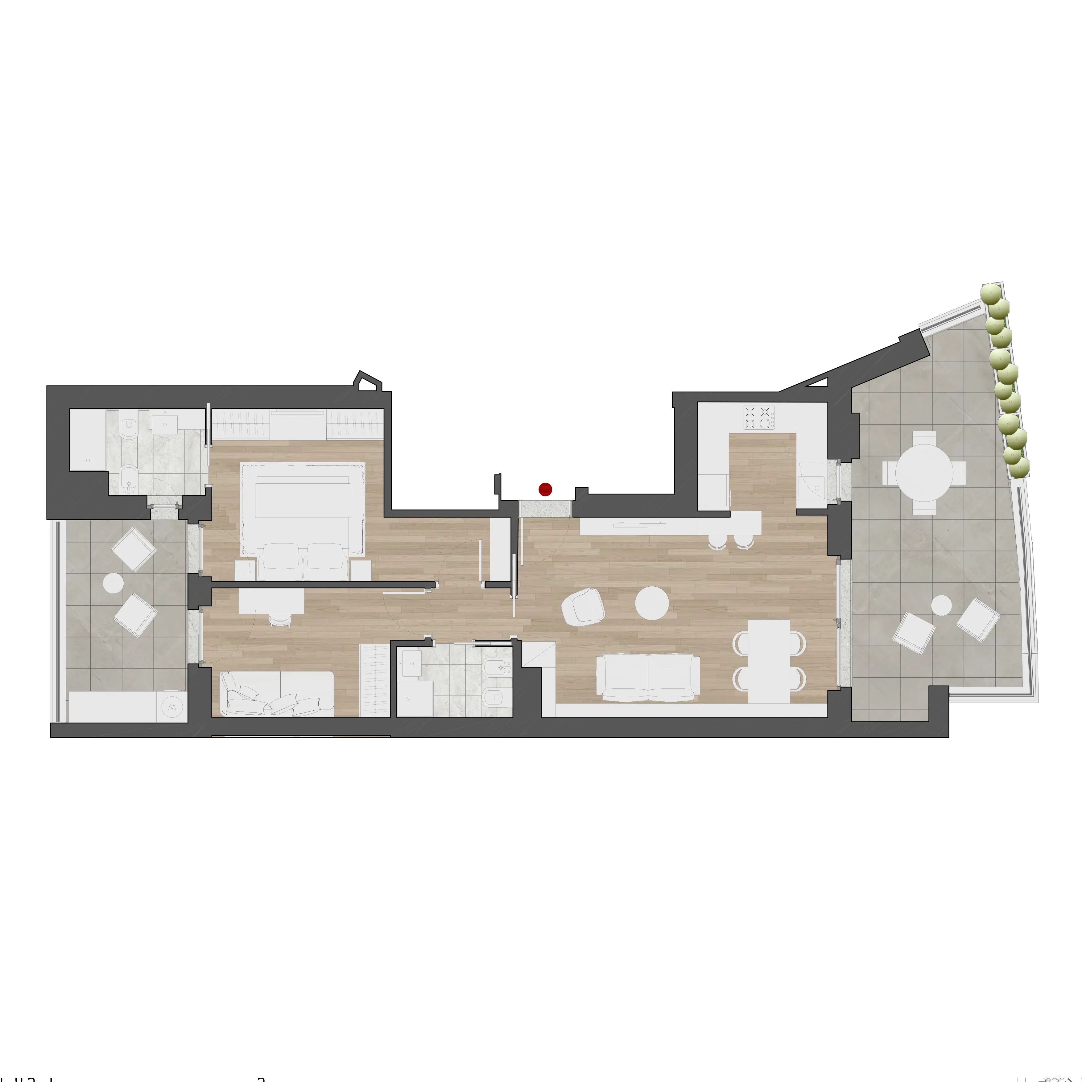 L'interno di ogni appartamento alle Residenze Chigi è il risultato di una progettazione attenta. La planimetria tipo di ogni tipologia di appartamento riflette la filosofia delle Residenze Chigi: spazi aperti e fluidi, camere da letto accoglienti, cucine moderne e bagni eleganti, tutti caratterizzati da un design che valorizza la convivialità e il relax.