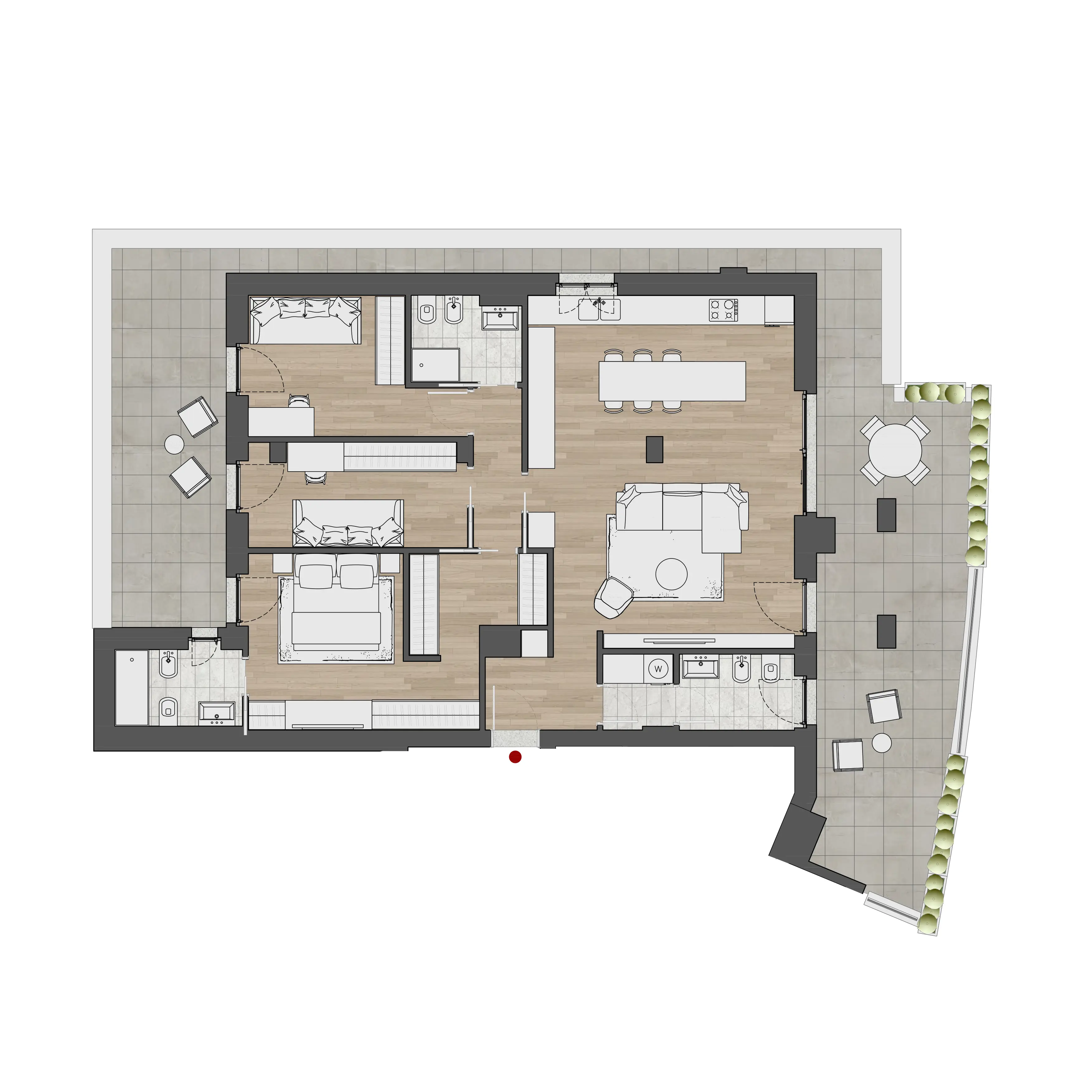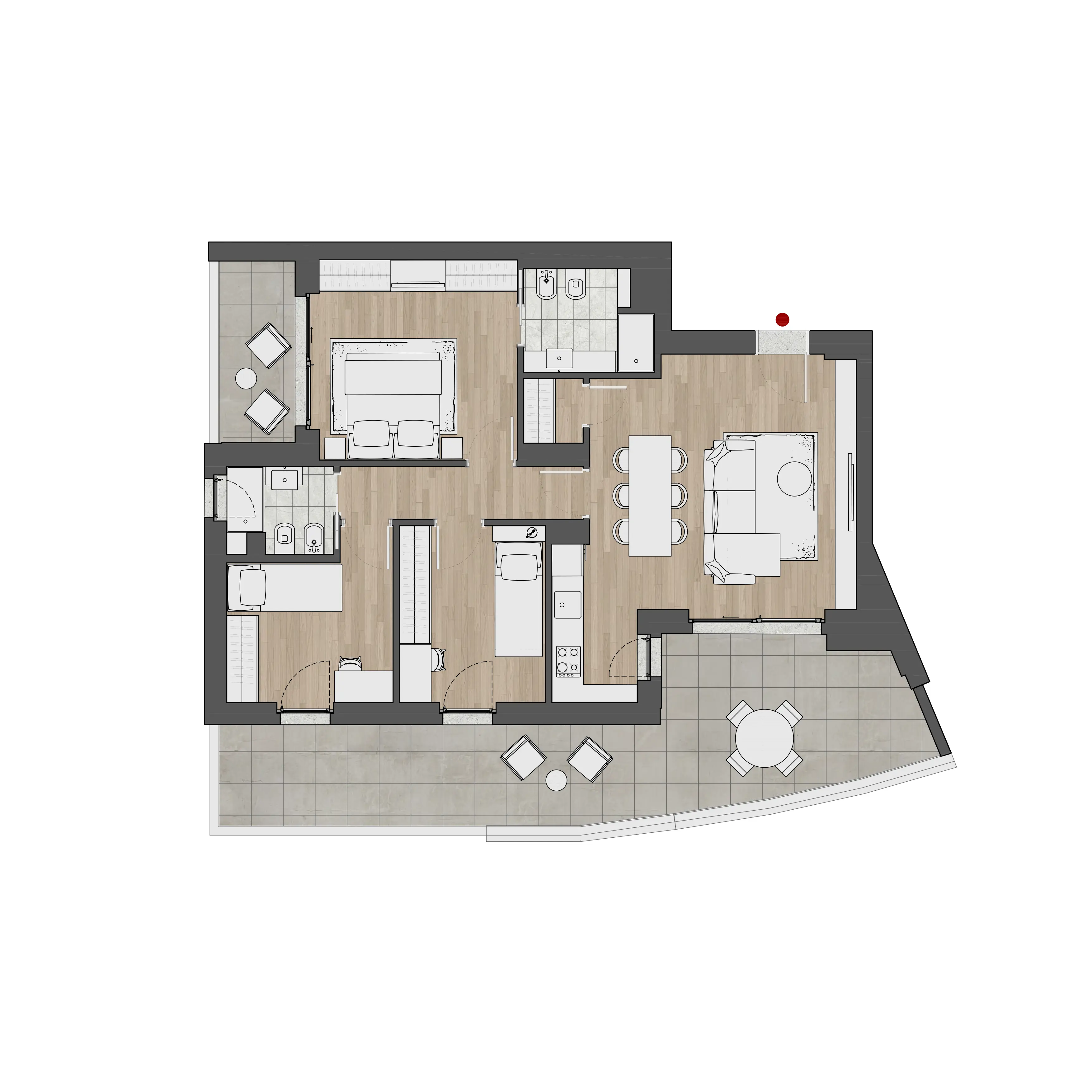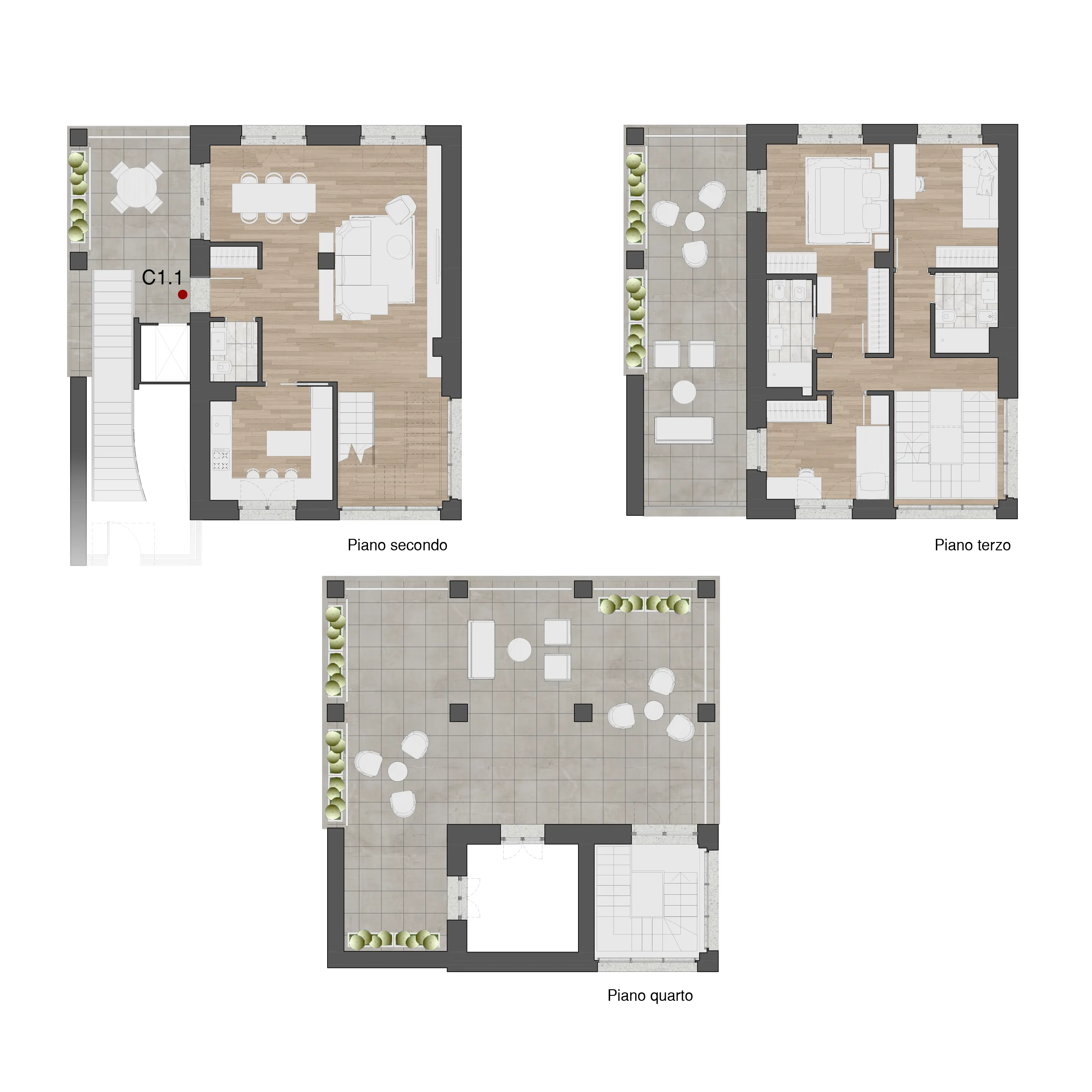 L'interno di ogni appartamento alle Residenze Chigi è il risultato di una progettazione attenta. La planimetria tipo di ogni tipologia di appartamento riflette la filosofia delle Residenze Chigi: spazi aperti e fluidi, camere da letto accoglienti, cucine moderne e bagni eleganti, tutti caratterizzati da un design che valorizza la convivialità e il relax.