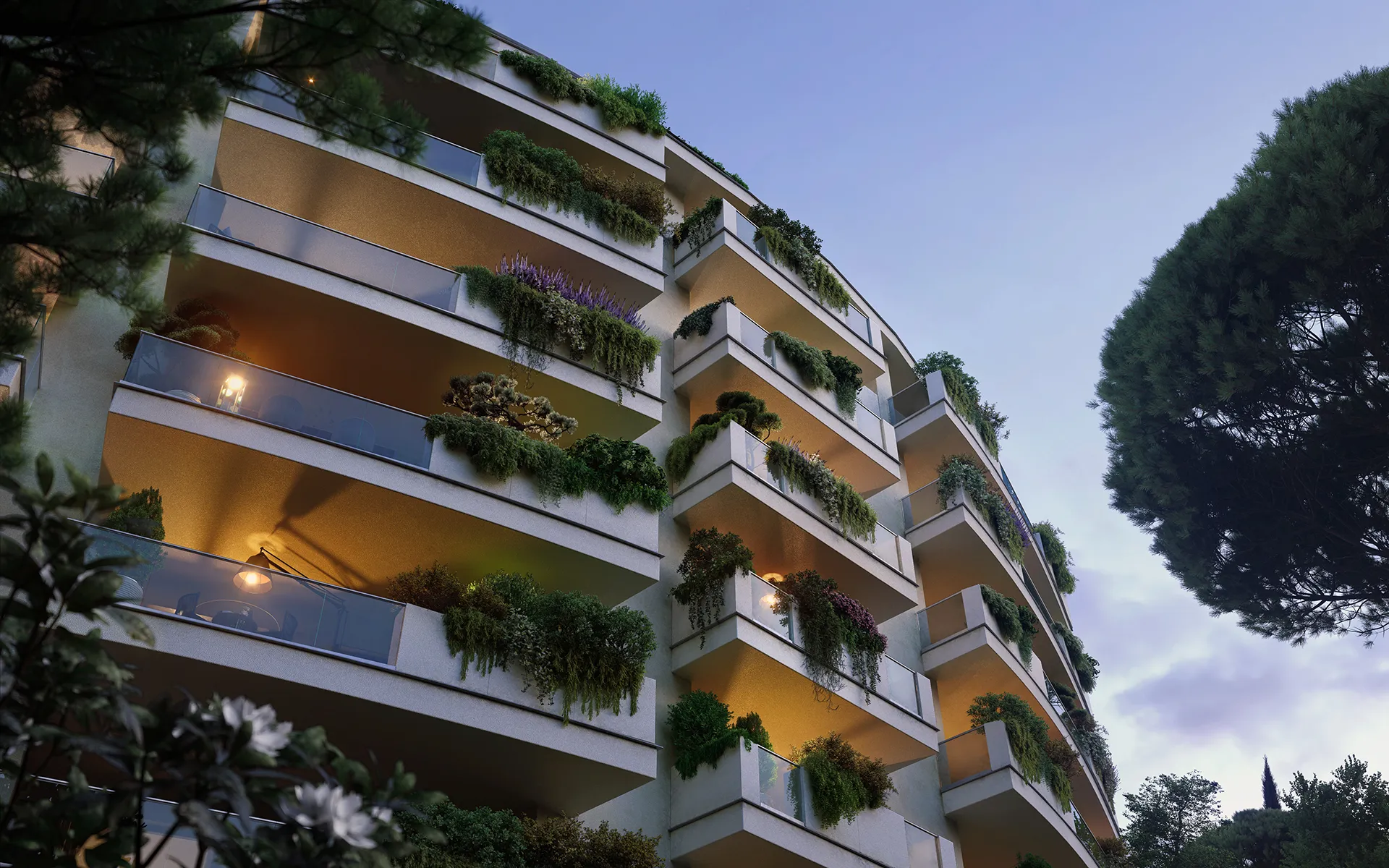 Le linee pulite e moderne degli esterni si uniscono ai toni delicati delle facciate, riflettendo la luce solare e fondendosi con la vivacità del verde terrazzato. L'utilizzo di materiali contemporanei, come il vetro e il metallo per i parapetti, si intreccia con la naturale bellezza del legno e delle piante ornamentali, creando un dialogo costante tra la struttura e l'ambiente circostante.